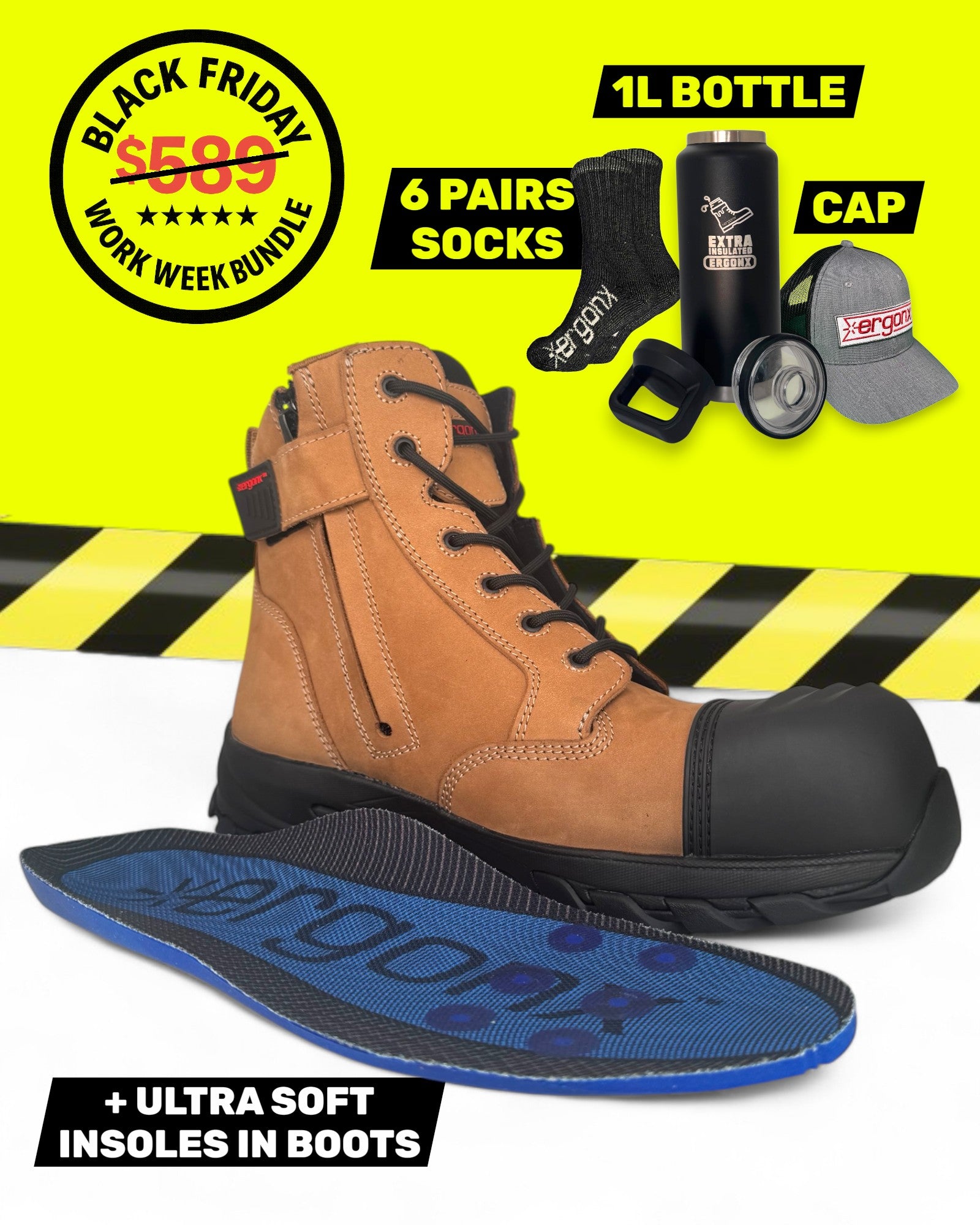 Ergonx Tan Lace Up Safety Boots + 6 Socks + 1L Bottle & Cap Bundle