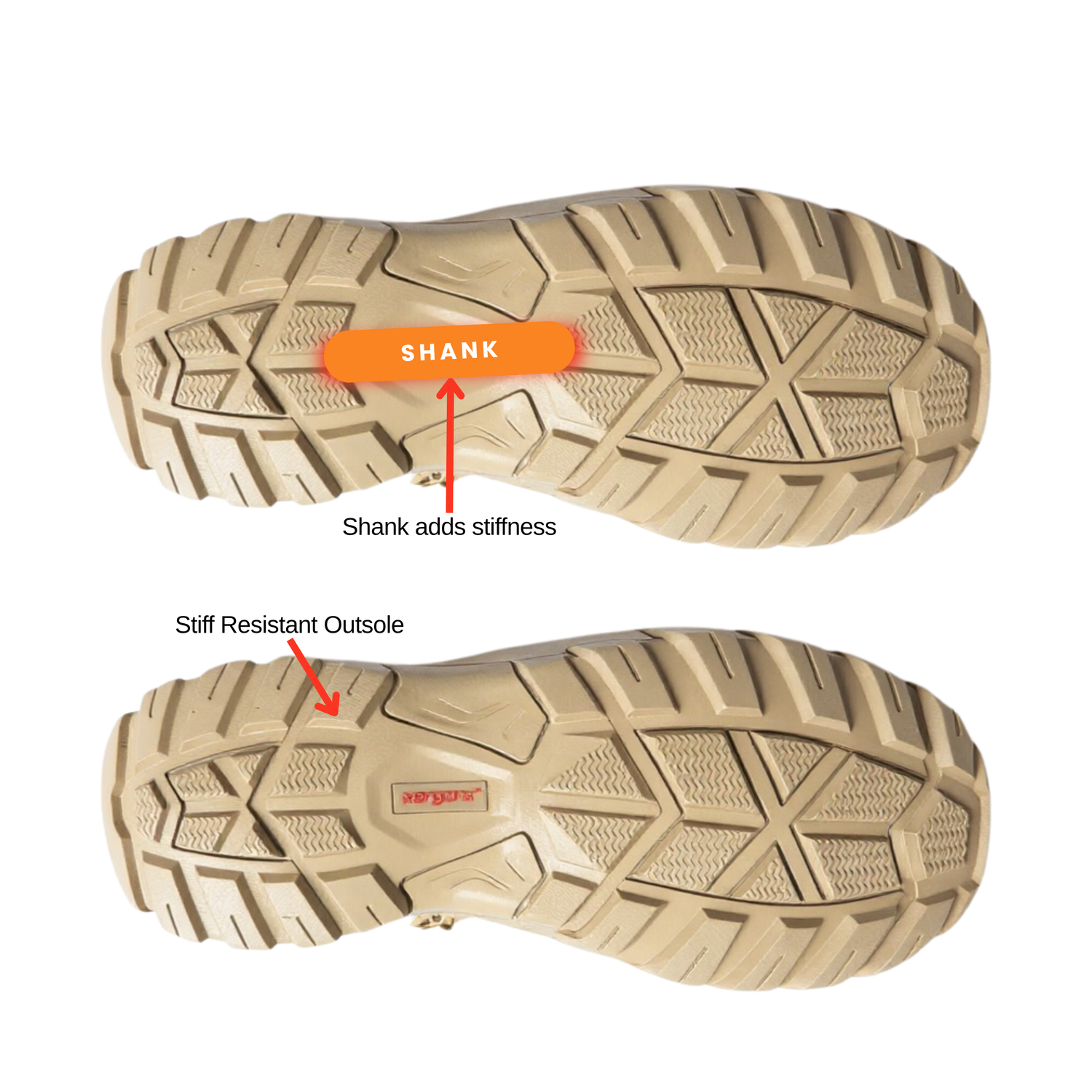 Uneven ground can be difficult to work on, so when working on rough or uneven job sites it is best to have a more rigid boot that works with the natural movements of your feet. The embedded shank adds stiffness only allowing bending where your foot bends.