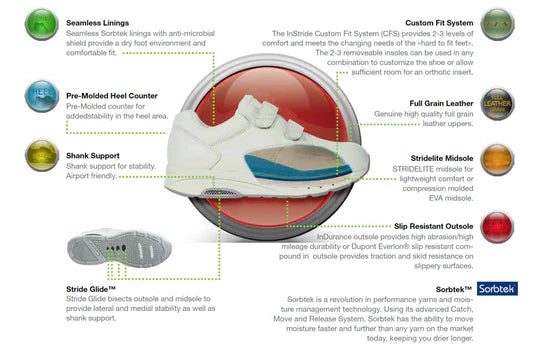 The InStride Custom Fit System (CFS) provides 2-3 levels of comfort and meets the changing needs of the hard to fit feet. The 2-3 removable insoles can be used in any combination to customize the shoe or allow sufficient room for an orthotic insert. Meets Medicare Shoe Billing Requirements.